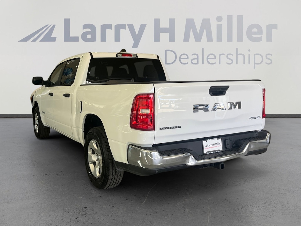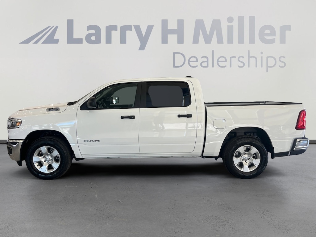 Larry H. MIller Chrysler Dodge Ram Fiat offers this 2025 Bright White Clearcoat Ram 1500 Big Horn/Lone Star 4WD. It is well equipped and includes these standard and optional features and benefits: Quick Order Package 23Z Big Horn (Big Horn Badge), 4-Wheel Disc Brakes, 6 Speakers, Air Conditioning, AM/FM radio, Brake assist, Bumpers: chrome, Dual front side impact airbags, Front Center Armrest w/Storage, GPS Antenna Input, Low tire pressure warning, Outside temperature display, Power door mirrors, Radio data system, Radio: Uconnect 5 W w/8.4 Display, RAM Grille Badge - Chrome, Speed control, USB Host Flip, 3 Rear Seat Head Restraints, 3.21 Rear Axle Ratio, 4 Way Front Headrests, 4G LTE Wi-Fi Hot Spot, ABS brakes, Alloy wheels, Apple CarPlay/Android Auto, Auto High-beam Headlights, Black Exterior Mirrors, Cloth Bench Seat, Compass, Connectivity - US/Canada, Convex Wide-Angle Exterior Mirror Insert, Delay-off headlights, Driver door bin, Dual front impact airbags, Electronic Stability Control, Exterior Mirrors w/Heating Element, Front anti-roll bar, Front fog lights, Front License Plate Bracket, Front reading lights, Front Seat Back Map Pockets, Front wheel independent suspension, Fully automatic headlights, Heated door mirrors, Illuminated entry, Integrated Voice Command w/Bluetooth, Manual Adjust 4-Way Front Passenger Seat, Manual Folding Exterior Mirrors, MOPAR Front & Rear Rubber Floor Mats, Occupant sensing airbag, Overhead airbag, Overhead console, Panic alarm, ParkView Rear Back-Up Camera, Passenger door bin, Passenger vanity mirror, Power steering, Power windows, Rear 60/40 Folding Seat, Rear anti-roll bar, Rear seat center armrest, Rear step bumper, Remote keyless entry, Split folding rear seat, Supplier Part Tracking (J-1), Tachometer, Telescoping steering wheel, Tilt steering wheel, Traction control, Trailer Brake Control, Trip computer, Variably intermittent wipers, Voltmeter, and Wheels: 18 x 8 Cast-Aluminum Painted. 4-Wheel Disc Brakes, 6 Speakers, Air Conditioning, AM/FM radio, Big Horn Badge, Brake assist, Bumpers: chrome, Dual front side impact airbags, Front Center Armrest w/Storage, GPS Antenna Input, Low tire pressure warning, Outside temperature display, Power door mirrors, Quick Order Package 23Z Big Horn, Radio data system, Radio: Uconnect 5 W w/8.4 Display, RAM Grille Badge - Chrome, Speed control, USB Host Flip. Price includes: $2000 - 2025 National Bonus Cash . Exp. 03/31/2026