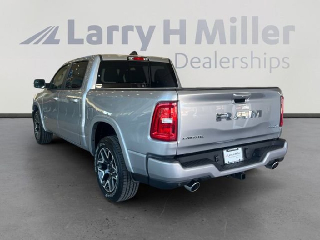 Larry H. MIller Chrysler Dodge Ram Fiat offers this 2026 Billet Silver Metallic Clearcoat Ram 1500 Laramie 4WD. It is well equipped and includes these standard and optional features and benefits: Advanced Safety Group II (12-Way/1-Way Trailer Connector, Active Driving Assist System, Drowsy Driver Detection, Evasive Steer Assist, Exterior Mirrors Approach Lamps, Intersection Collision Assist System, Surround View Camera System, and Traffic Sign Recognition), Laramie Level 2 Equipment Group (14.4 Touchscreen Display, 4G LTE Wi-Fi Hot Spot, Cluster 12 TFT Color Display, Connected Travel and Traffic Services, Connectivity - US/Canada, Front Passenger Interactive Display, GPS Navigation, Harman/Kardon 19 Speaker Premium Sound, Integrated Center Stack Radio, Integrated Voice Command with Bluetooth, Power Tailgate, Radio: Uconnect 5 Nav with 14.4 Display, Rain Sensitive Windshield Wipers, SiriusXM Radio Service, SiriusXM with 360L, and USB Host Flip), Quick Order Package 21H Laramie, Sport Appearance Package (Accent Color Premium Power Mirrors, Auto Power-Folding Mirrors, Auto-Dimming Exterior Driver Mirror, Black Interior Accents, Black Painted Exterior Mirrors Caps, Body Color Front Bumper, Body Color Rear Bumper with Step Pads, Bridgestone Brand Tires, Convex Wide-Angle Exterior Mirror Insert, Exterior Mirrors Courtesy Lamps, Exterior Mirrors with Heating Element, Exterior Mirrors with Memory, Exterior Mirrors with Supplemental Signals, Grille Surround 3 Body Color Tex 2 Black, RAM Grille Badge - Chrome, and Sport Performance Hood), 10 Speakers, 33 Gallon Fuel Tank, 4-Wheel Disc Brakes, ABS brakes, Active Noise Control System, Adjustable pedals, Air Conditioning, Alloy wheels, AM/FM radio: SiriusXM with 360L, Apple CarPlay/Android Auto, Audio memory, Auto High-beam Headlights, Auto-dimming door mirrors, Auto-dimming Rear-View mirror, Automatic temperature control, Brake assist, Bumpers: chrome, Chrome Exterior Mirrors, Compass, Delay-off headlights, Dome Dual LED Reading Lamp, Driver door bin, Driver vanity mirror, Dual front impact airbags, Dual front side impact airbags, Dual-Pane Panoramic Sunroof, Electronic Stability Control, Front anti-roll bar, Front Bucket Seats, Front Center Armrest w/Storage, Front dual zone A/C, Front fog lights, Front License Plate Bracket, Front reading lights, Front wheel independent suspension, Fully automatic headlights, Garage door transmitter, Heated door mirrors, Heated front seats, Heated rear seats, Heated steering wheel, Illuminated entry, Leather steering wheel, Leather Trimmed Bucket Seats, LED Dome/Reading Lamp, Low tire pressure warning, Memory seat, MOPAR Front and Rear Rubber Floor Mats, Navigation System, Occupant sensing airbag, Off-Road Information Pages, Outside temperature display, Overhead airbag, Overhead console, Panic alarm, ParkView Rear Back-Up Camera, Passenger door bin, Passenger vanity mirror, Pedal memory, Power door mirrors, Power driver seat, Power passenger seat, Power steering, Power windows, Radio data system, Radio: Uconnect 5 Navigation with 12.0 Display, Rear anti-roll bar, Rear reading lights, Rear seat center armrest, Rear step bumper, Remote keyless entry, Security system, Speed control, Split folding rear seat, Steering wheel mounted audio controls, Tachometer, Telescoping steering wheel, Tilt steering wheel, Traction control, Trailer Brake Control, Trip computer, Turn signal indicator mirrors, Variably intermittent wipers, Ventilated front seats, Voltmeter, and Wheels: 20 x 9 Premium Paint/Polish. Price includes: $1000 - 2026 National Bonus Cash . Exp. 03/31/2026 $3500 - 2026 National Retail Bonus Cash . Exp. 03/31/2026