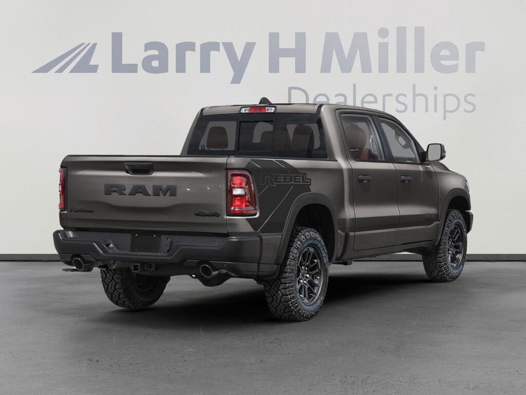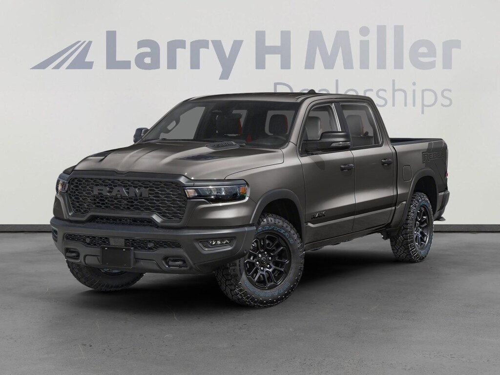 Larry H. MIller Chrysler Dodge Ram Fiat offers this 2026 Granite Crystal Metallic Clearcoat Ram 1500 Rebel 4WD. It is well equipped and includes these standard and optional features and benefits: Quick Order Package 21W Rebel, Rebel Level 1 Equipment Group (Auto Power-Folding Mirrors, Auto-Dimming Exterior Driver Mirror, Black Exterior Mirrors, Black Premium Power Mirrors, Convex Wide-Angle Exterior Mirror Insert, Exterior Mirrors Courtesy Lamps, Exterior Mirrors with Heating Element, Exterior Mirrors with Supplemental Signals, Power Adjustable Pedals, Rear Window Defroster, Remote Tailgate Release, and Wireless Charging Pad), 10 Speakers, 3.92 Rear Axle Ratio, 4 Way Front Headrests, 4-Wheel Disc Brakes, 4G LTE Wi-Fi Hot Spot, ABS brakes, Active Noise Control System, Air Conditioning, Alloy wheels, AM/FM radio: SiriusXM with 360L, Apple CarPlay, Apple CarPlay/Android Auto, Auto High-beam Headlights, Auto-dimming Rear-View mirror, Automatic temperature control, Brake assist, Bucket Seats, Cloth/Vinyl Bucket Seats, Compass, Connected Travel and Traffic Services, Connectivity - US/Canada, Delay-off headlights, Disassociated Touchscreen Display, Driver door bin, Driver vanity mirror, Dual front impact airbags, Dual front side impact airbags, Electronic Stability Control, Front anti-roll bar, Front Bucket Seats, Front Center Armrest w/Storage, Front dual zone A/C, Front fog lights, Front License Plate Bracket, Front reading lights, Front Seat Back Map Pockets, Front wheel independent suspension, Full Length Upgraded Floor Console, Fully automatic headlights, Garage door transmitter, Global Telematics Box Module, Google Android Auto, GPS Antenna Input, GPS Navigation, HD Radio, Heated door mirrors, Heated Front Seats, Heated front seats, Heated Steering Wheel, Heated steering wheel, Illuminated entry, Integrated Center Stack Radio, Integrated Voice Command with Bluetooth, Leather steering wheel, Low tire pressure warning, Manual Folding Exterior Mirrors, Manufacturer's Statement of Origin, MyFlexCare Service Plan, Navigation System, Occupant sensing airbag, Off-Road Information Pages, Outside temperature display, Overhead airbag, Overhead console, Panic alarm, ParkView Rear Back-Up Camera, Passenger door bin, Passenger vanity mirror, Power 2-Way Driver Lumbar Adjust, Power Adjust 8-Way Driver Seat, Power door mirrors, Power driver seat, Power steering, Power windows, Radio data system, Radio: Uconnect 5 Navigation with 12.0 Display, Rear 60/40 Folding Seat, Rear anti-roll bar, Rear seat center armrest, Rear step bumper, Rear Wheelhouse Liners, Remote keyless entry, SiriusXM Radio Service, SiriusXM with 360L, Speed control, Split folding rear seat, Steering wheel mounted audio controls, Tachometer, Telescoping steering wheel, Tilt steering wheel, Traction control, Trailer Brake Control, Trip computer, USB Host Flip, Variably intermittent wipers, Voltmeter, and Wheels: 18 x 8.0 Painted Mid-Gloss Black. Price includes: $3500 - 2026 National Retail Bonus Cash . Exp. 04/30/2026 $750 - 2026 West BC Spring Boost Retail Bonus Cash . Exp. 04/30/2026